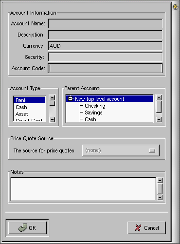 The picture below shows an example for a stock or currency trading account. Note that the Security field is not grayed out, and that you can enter a value. That value is typically a three-letter ISO currency code.