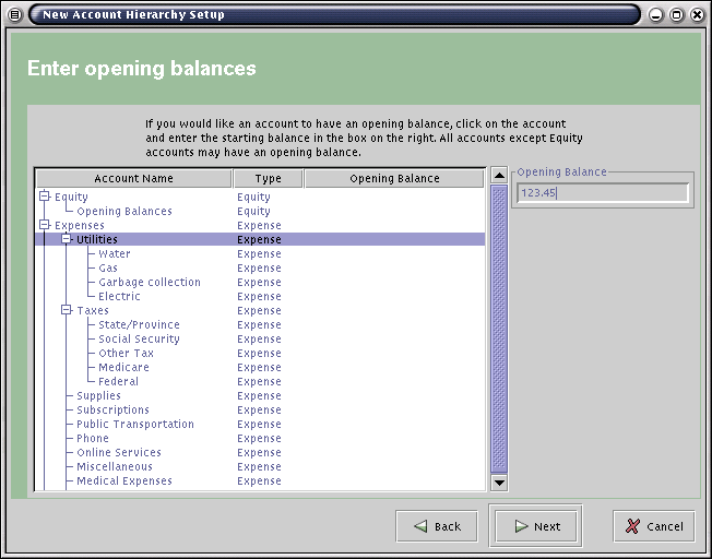 To set starting balances click on the line with the account you'd like to set and type the starting balance in the text box on the right.