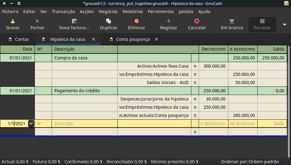 As transacções que inserir na conta Activos:Activos actuais:Conta poupança devem parecer-se com isto: