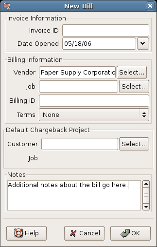 Jobs (optional) is where you register Vendor Jobs. Jobs are mechanism by which you can group multiple bills from a particular vendor.